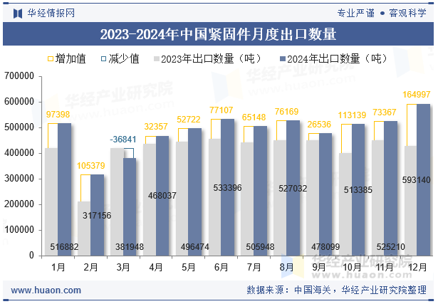 華經(jīng)產(chǎn)業(yè)研究院數(shù)據(jù)顯示:2024年中國(guó)緊固件出口數(shù)量為5851481噸,與2023年相比增長(zhǎng)了872662噸,同比增長(zhǎng)17.6%。