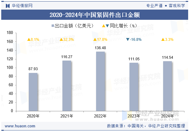 2024年中國(guó)緊固件出口金額為114.54億美元,與2023年相比增長(zhǎng)了3.49億美元,同比增長(zhǎng)3.3%。